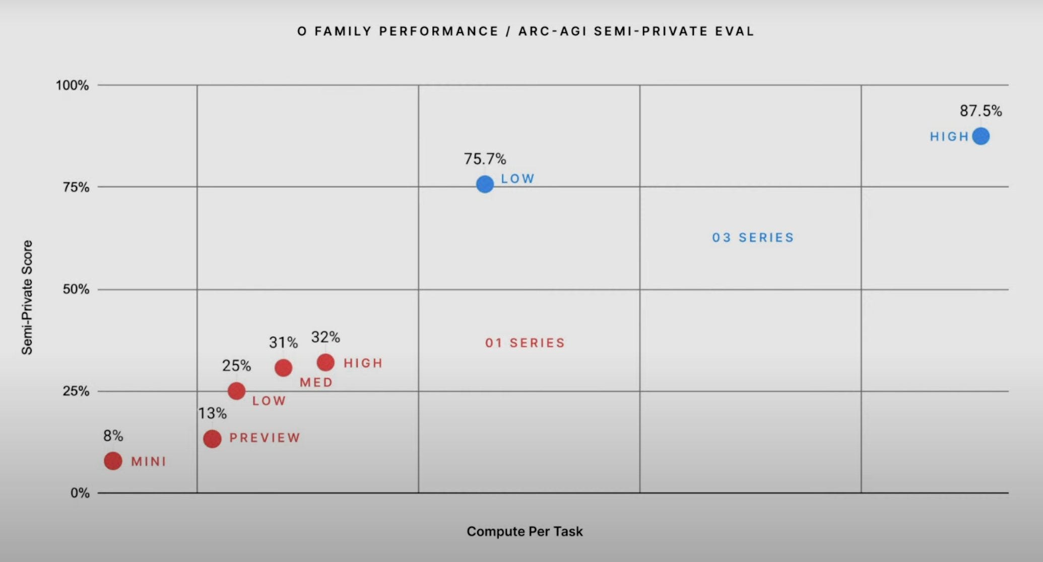 The true testament to o3's prowess lies in its benchmark performances. On the ARC-AGI Public Benchmark, o3 scores a remarkable 75.7%, eclipsing its predecessor and edging closer to human-level intelligence, defined at 85%. In high-compute mode, o3 achieves an impressive 87.5%, surpassing human performance and signaling a potential breakthrough toward AGI.